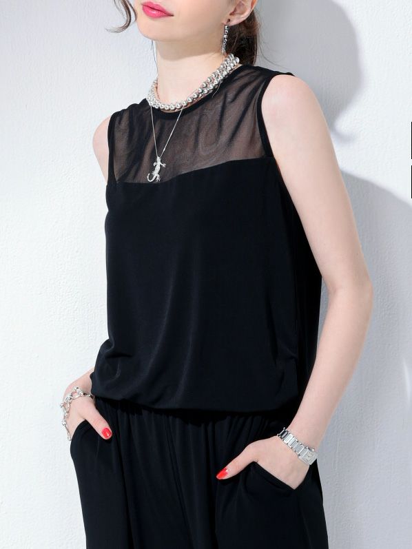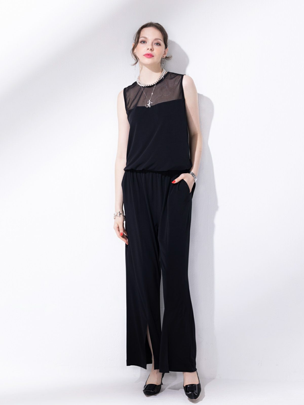 透け感のあるトップがデコルテを美しく引き立てる、ブラックオールインワン。