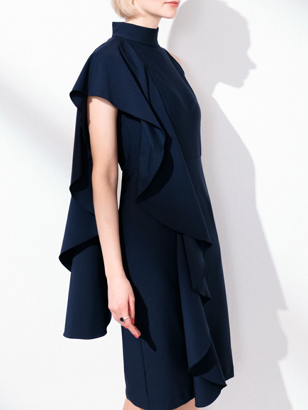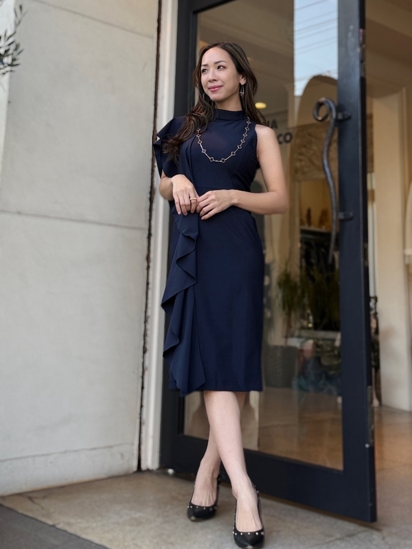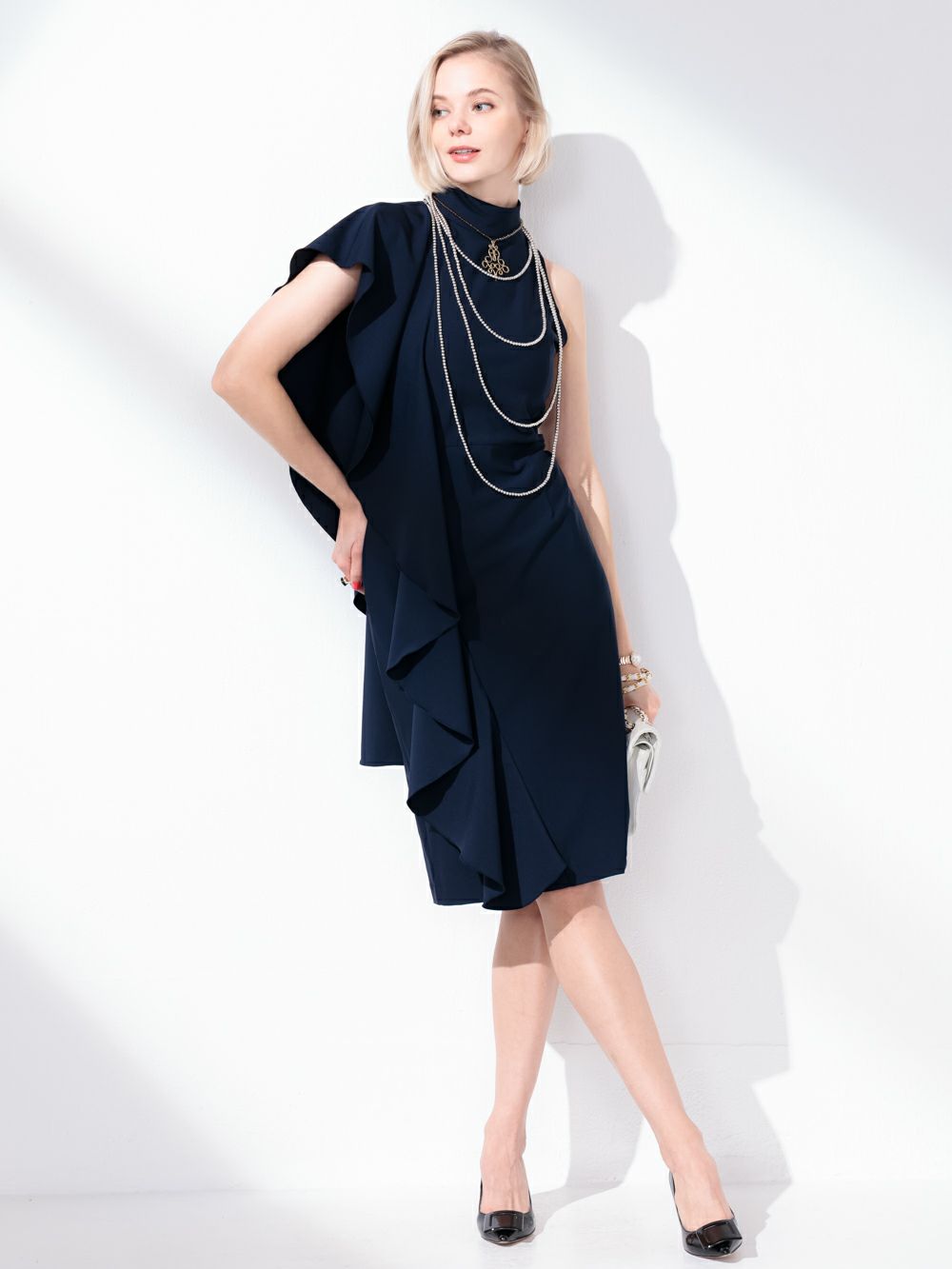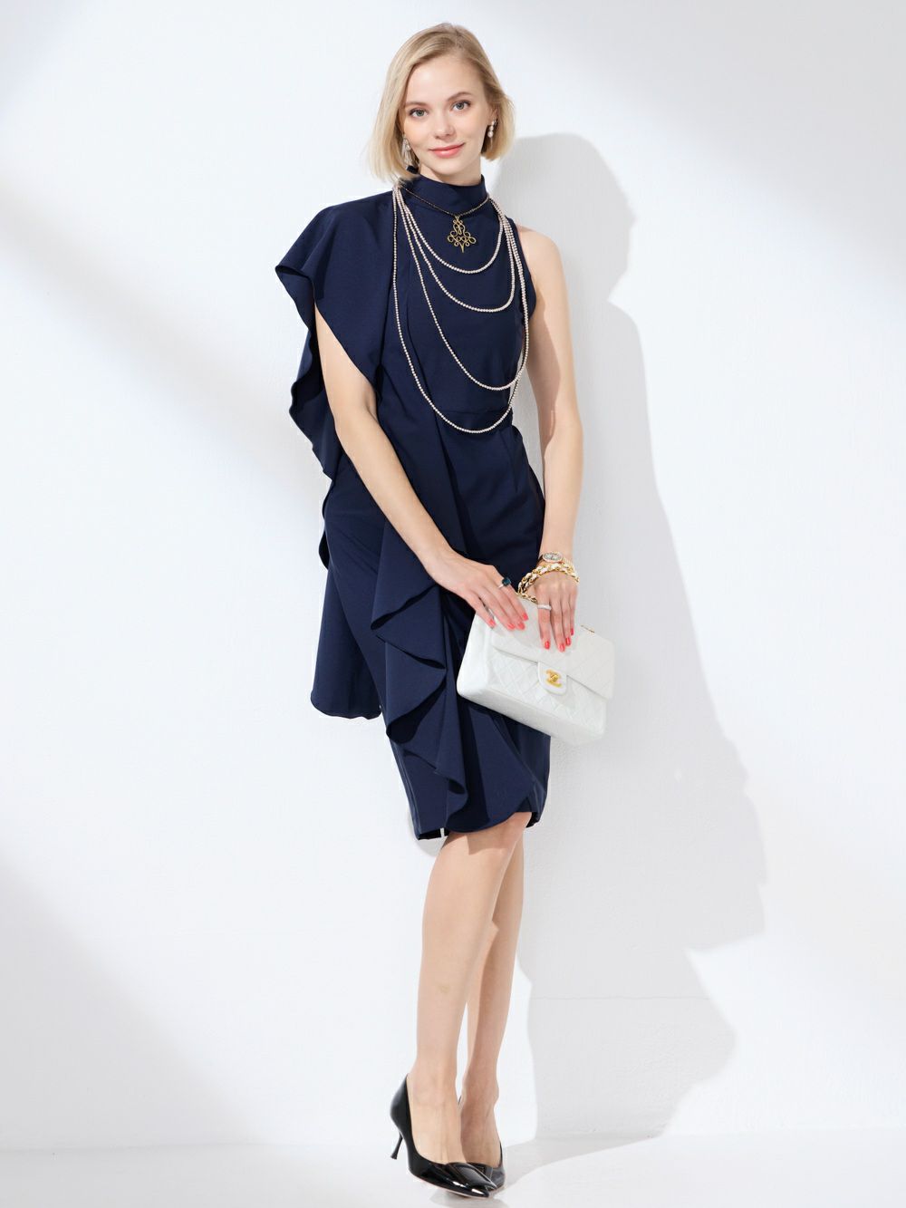 立体的なドレープが美しく映える、アシンメトリーラッフルドレス。