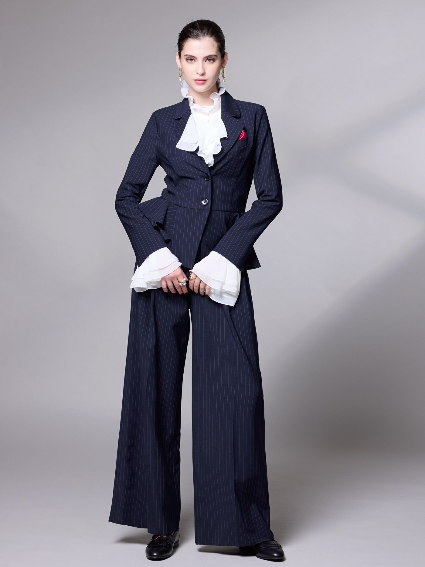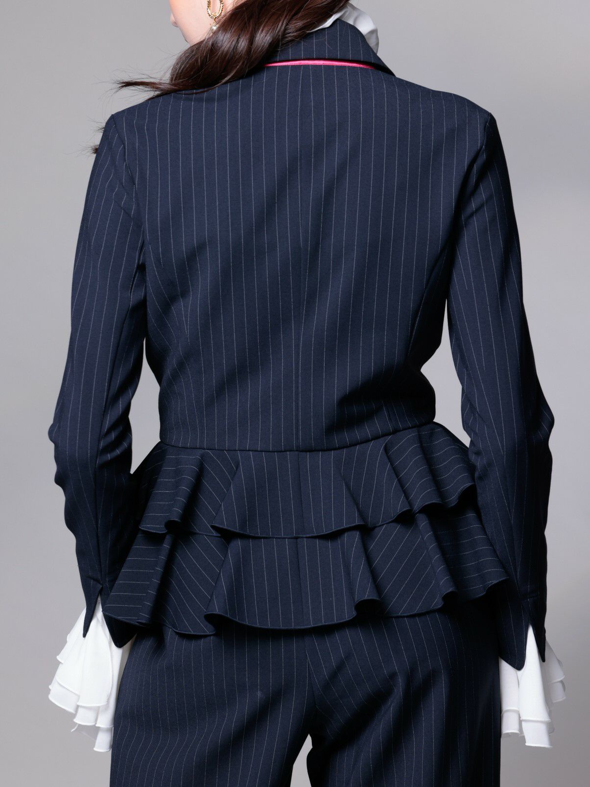 ペプラムの立体的なシルエットと、裾の繊細なフリルが優雅な動きを描きます。