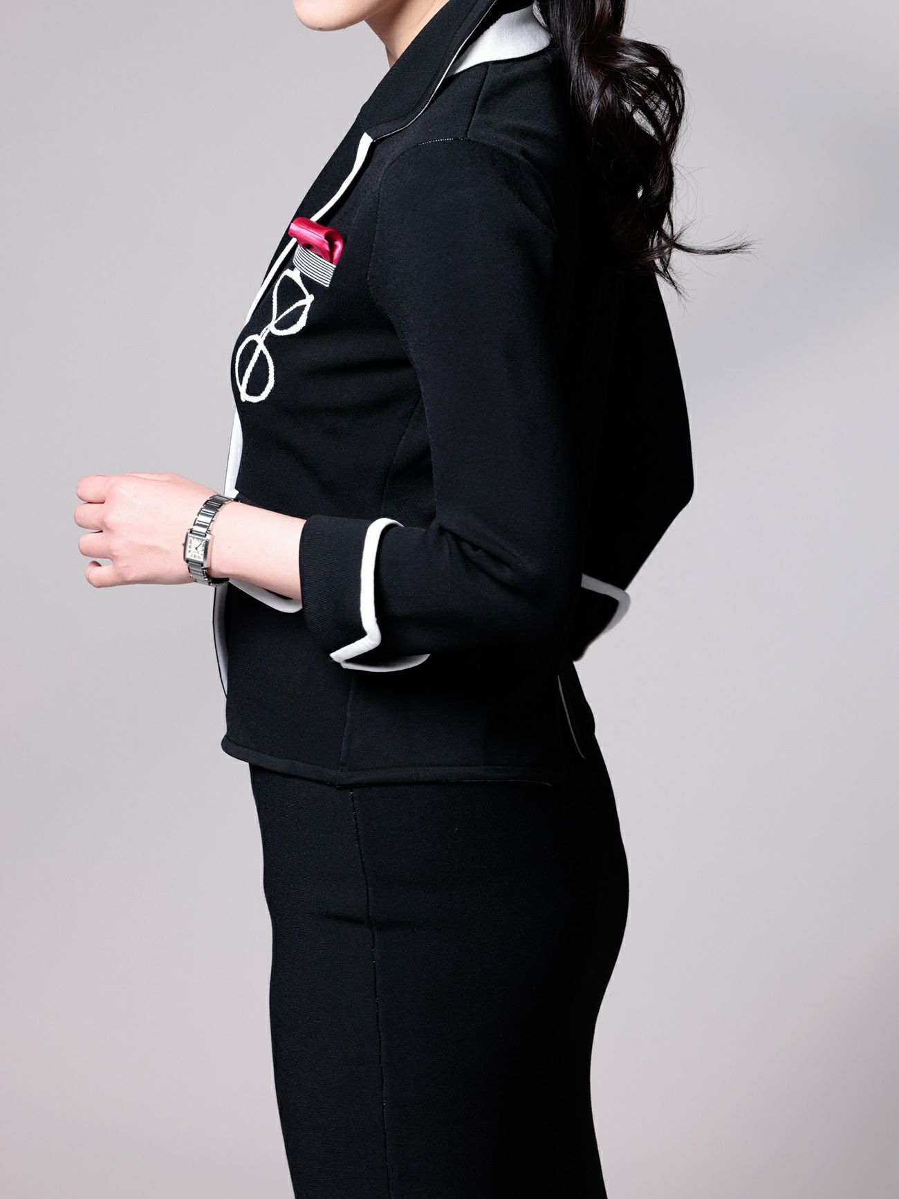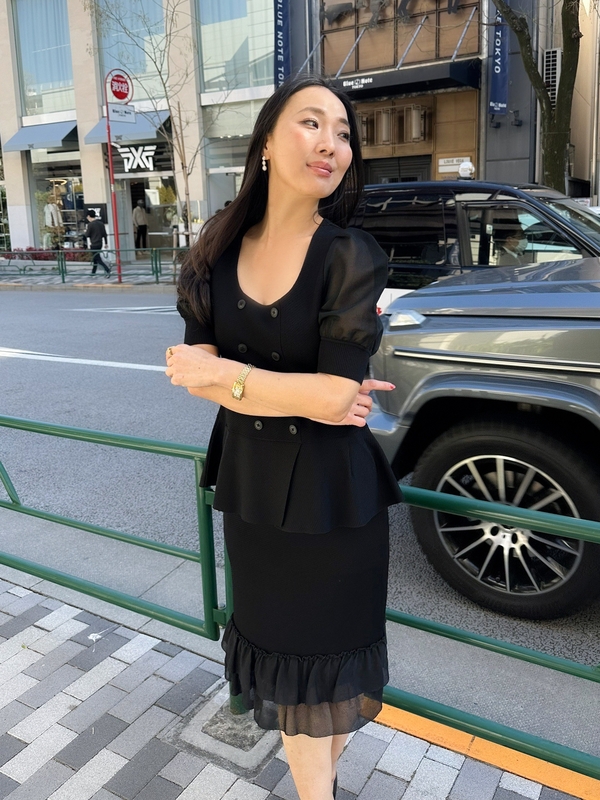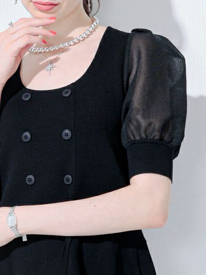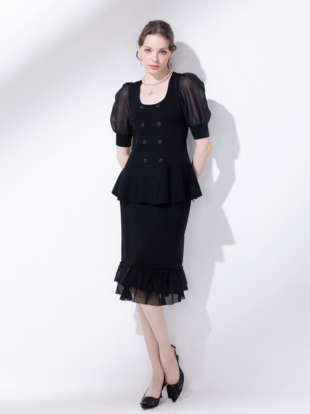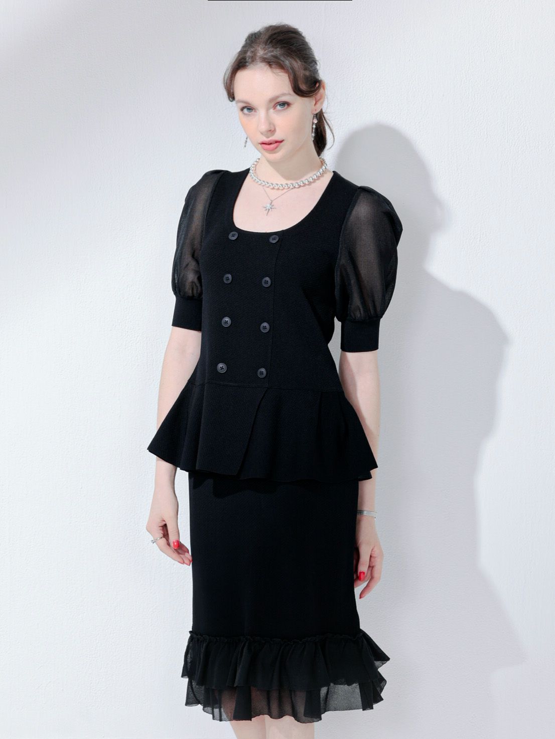 シアーなパフスリーブが、ブラックに軽やかな奥行きを添えるニットスーツ。