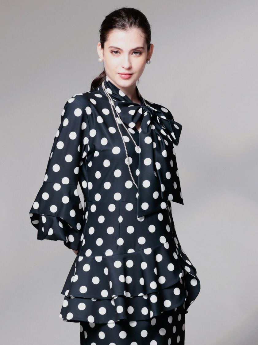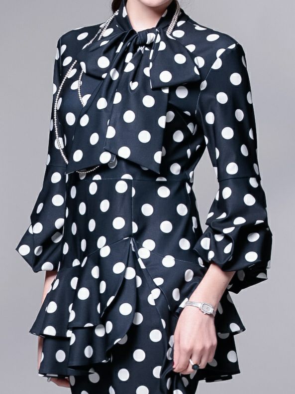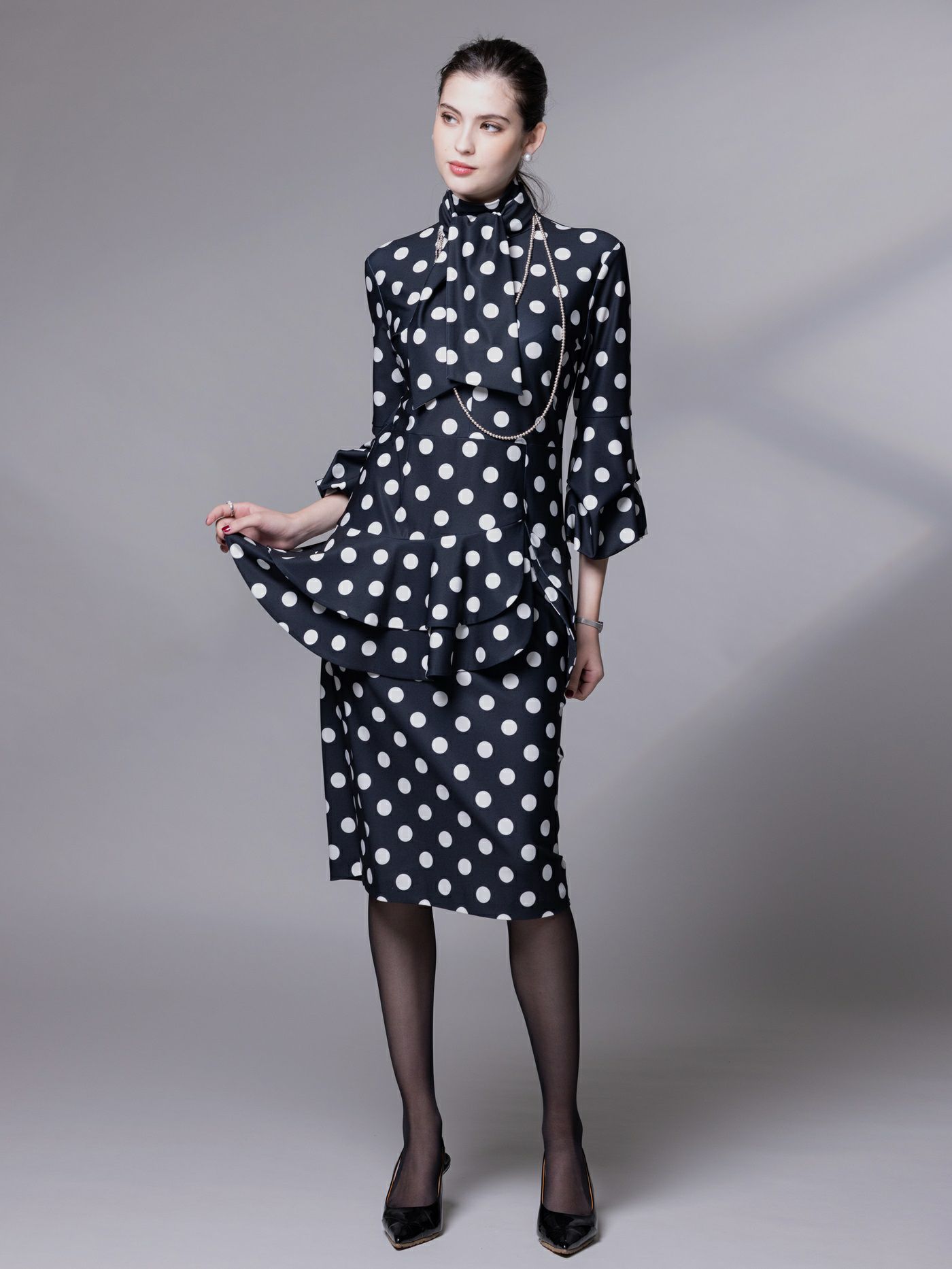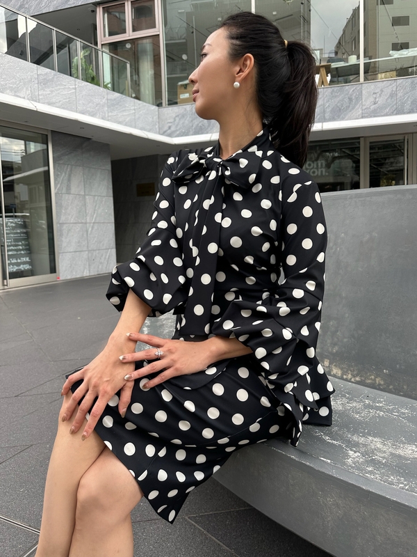 動くたびに揺れるフリルが印象的な、クラシカルなドットワンピース。