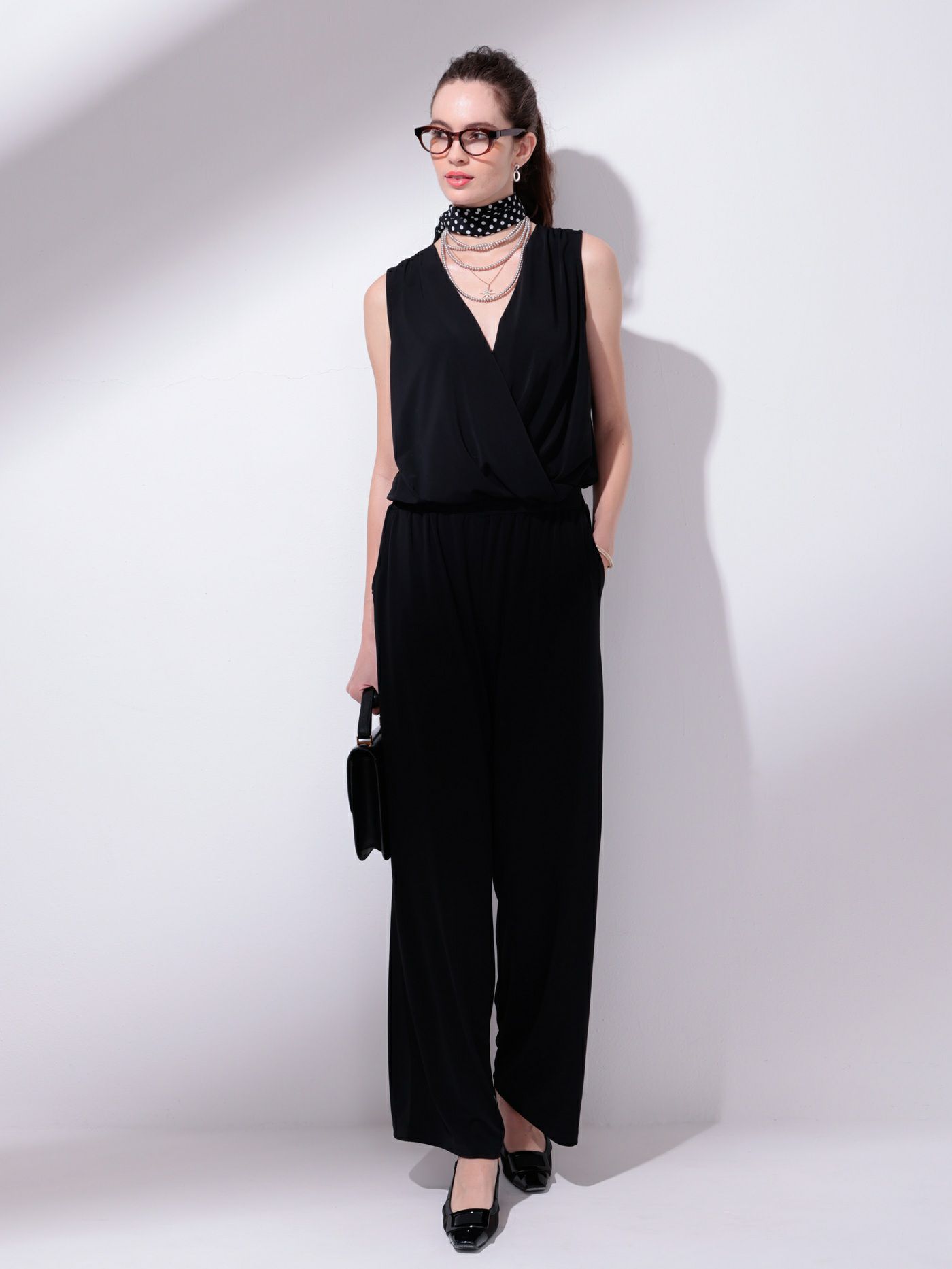 深めのVネックがデコルテを美しく見せる、カシュクールオールインワン。