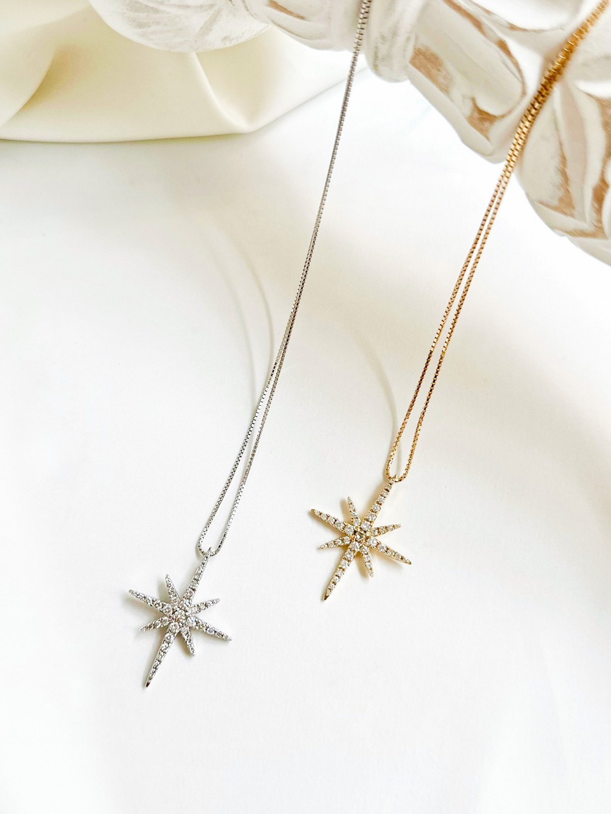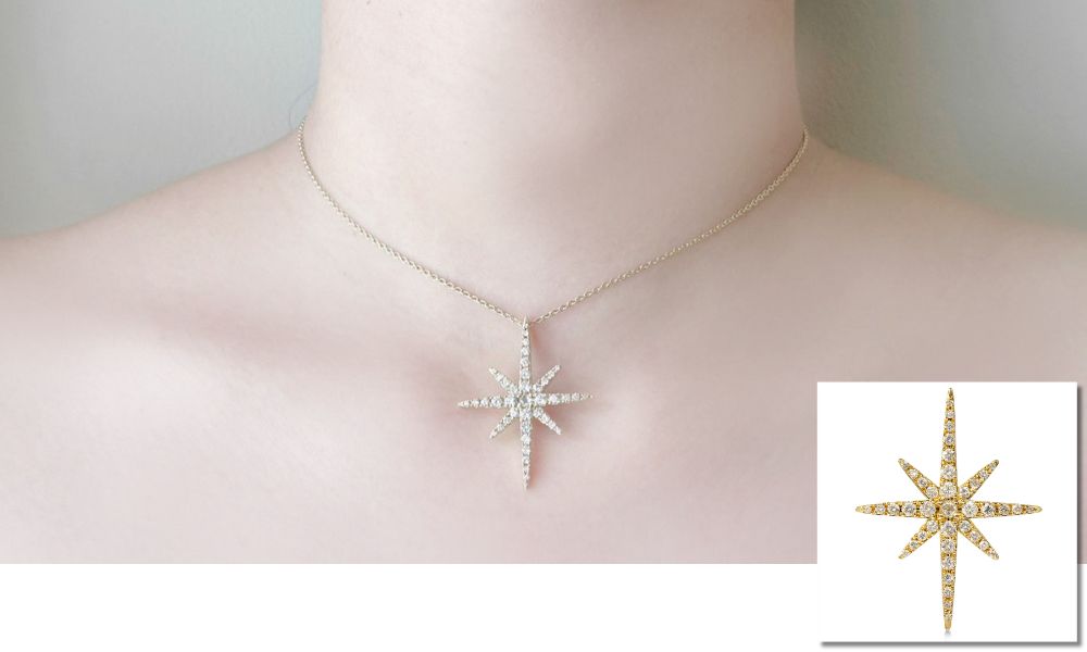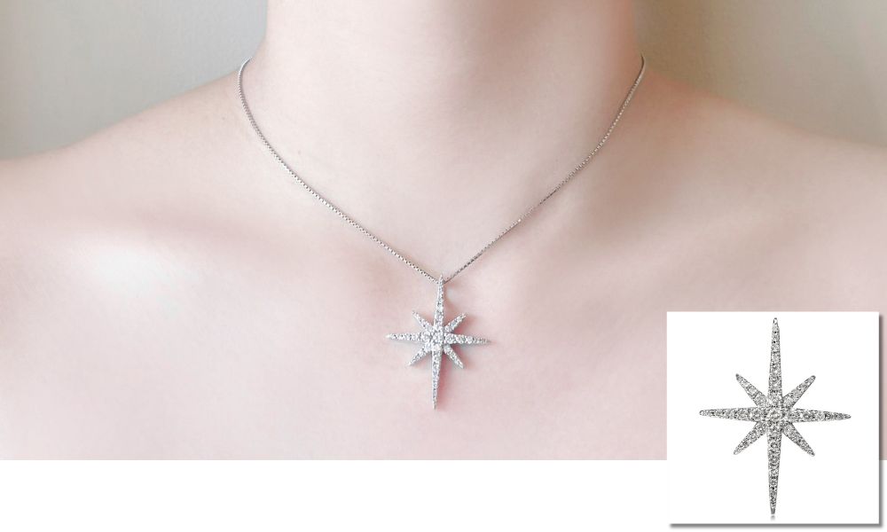胸元にキラリと光るスターモチーフのペンダント。