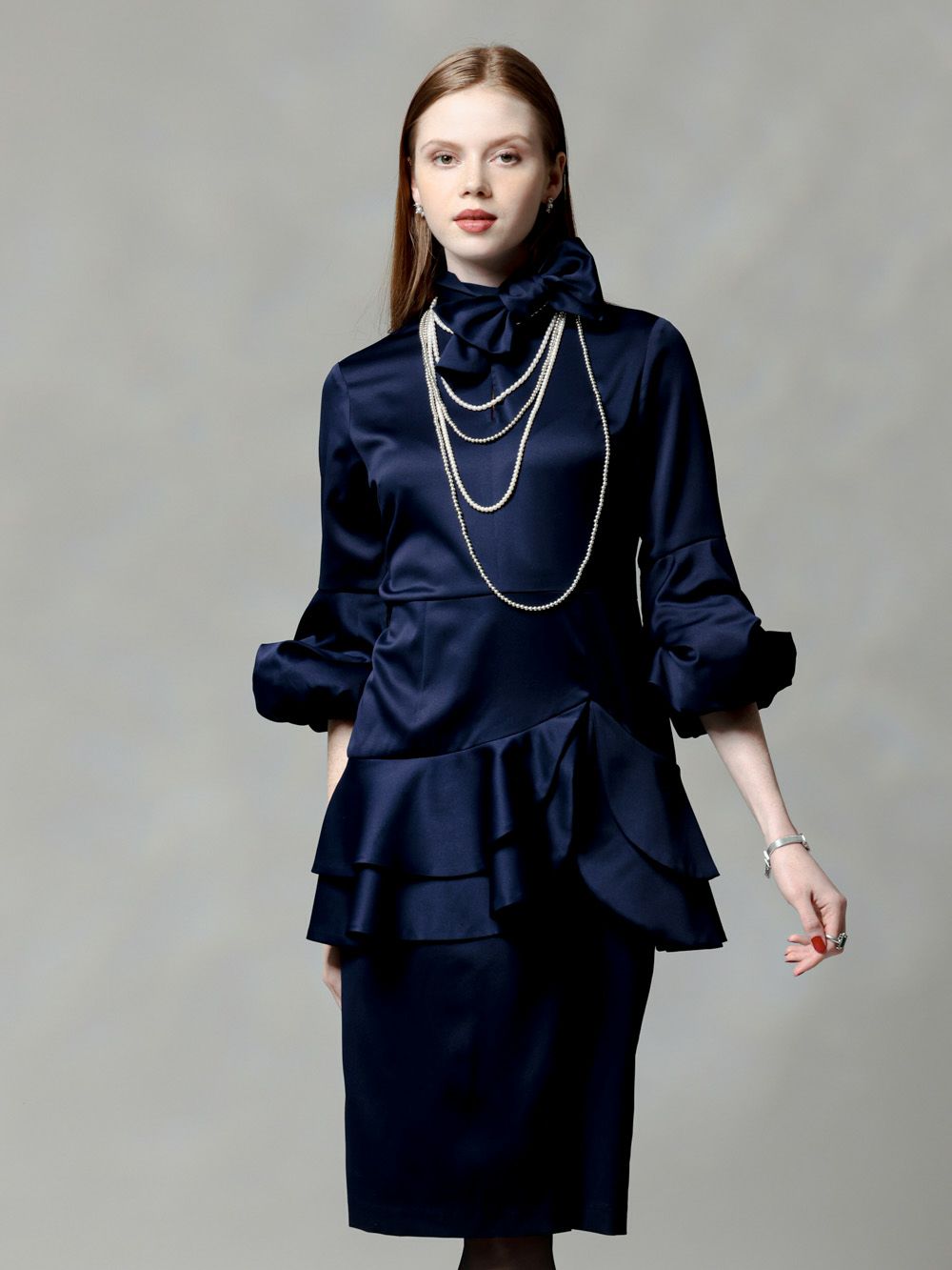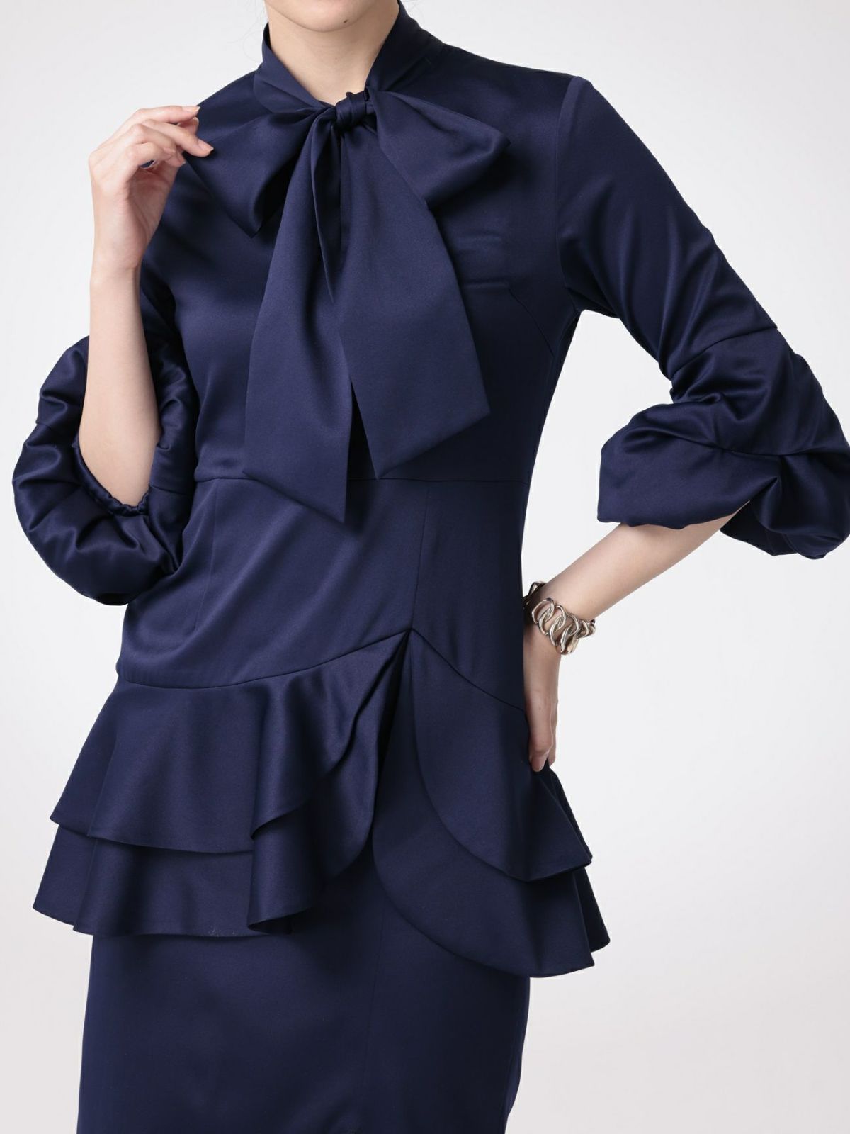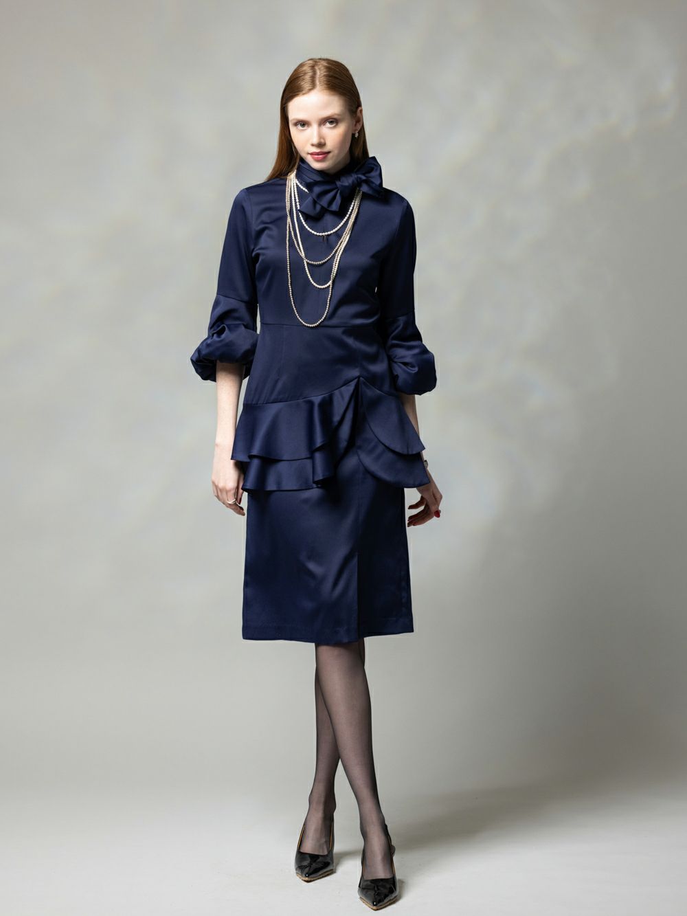 ネイビーパフスリーブワンピース